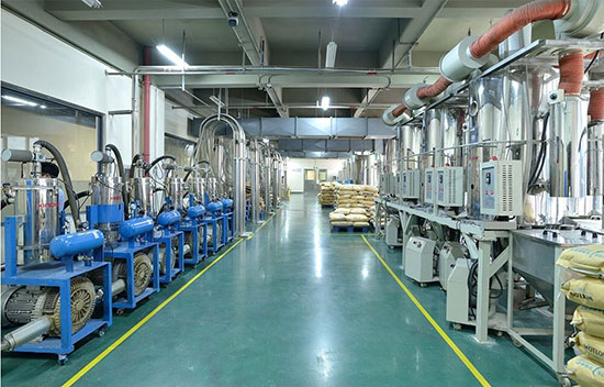 中央供料系統(tǒng)采用高壓鼓風(fēng)機(jī)真空輸送方式,通過(guò)集中的管路系統(tǒng)將塑料原料從儲(chǔ)料罐輸送到中央干燥系統(tǒng),然后將干燥后的原料輸送到每臺(tái)注塑機(jī)中。中央輸送系統(tǒng)采用“一臺(tái)機(jī)器一根管”的設(shè)計(jì)方式,保證整個(gè)系統(tǒng)運(yùn)行穩(wěn)定,絕無(wú)堵料的現(xiàn)象發(fā)生。高壓風(fēng)機(jī)配合中央干燥系統(tǒng)使用,可使用干燥的空氣對(duì)原料進(jìn)行輸送,防止干燥后的原料回潮。同時(shí)在每個(gè)輸送循環(huán)后會(huì)對(duì)輸送管線進(jìn)行清理,確保管路內(nèi)沒(méi)有殘余的粒料,在避免原料回潮的同時(shí),也保證了加入注塑機(jī)中的原料性能的一致。在高壓鼓風(fēng)機(jī)真空負(fù)壓作用下,原料中原有的粉塵會(huì)通過(guò)粉塵過(guò)濾系統(tǒng)被過(guò)濾出來(lái),有助于提高成型產(chǎn)品的質(zhì)量.